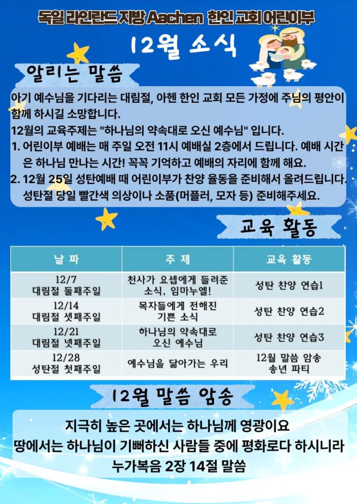 2025년 12월 7일 예배부터 교회학교 예배를 새롭게 시작합니다.